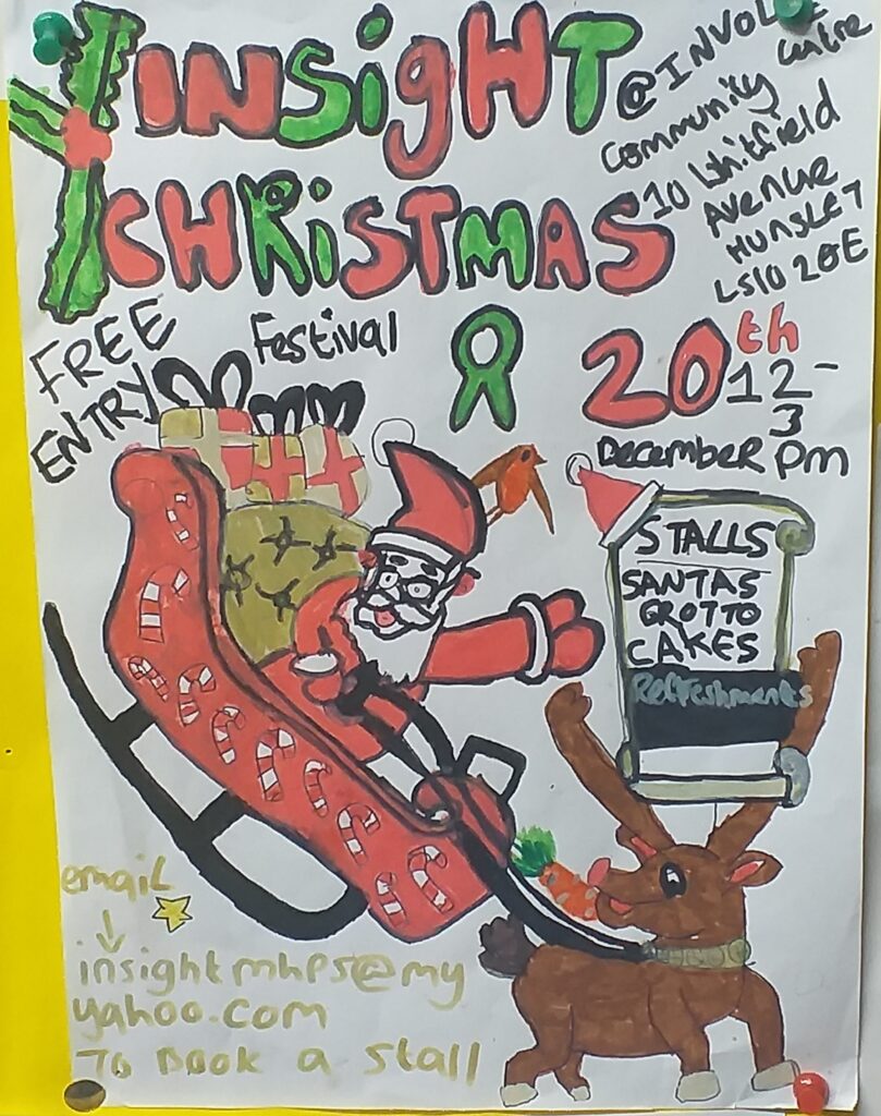 Join Insight for their Christmas Festival on Saturday 20 December from 12-3pm at Involve Community Centre, 10 Whitfield Avenue, Hunslet, LS10 2QE.